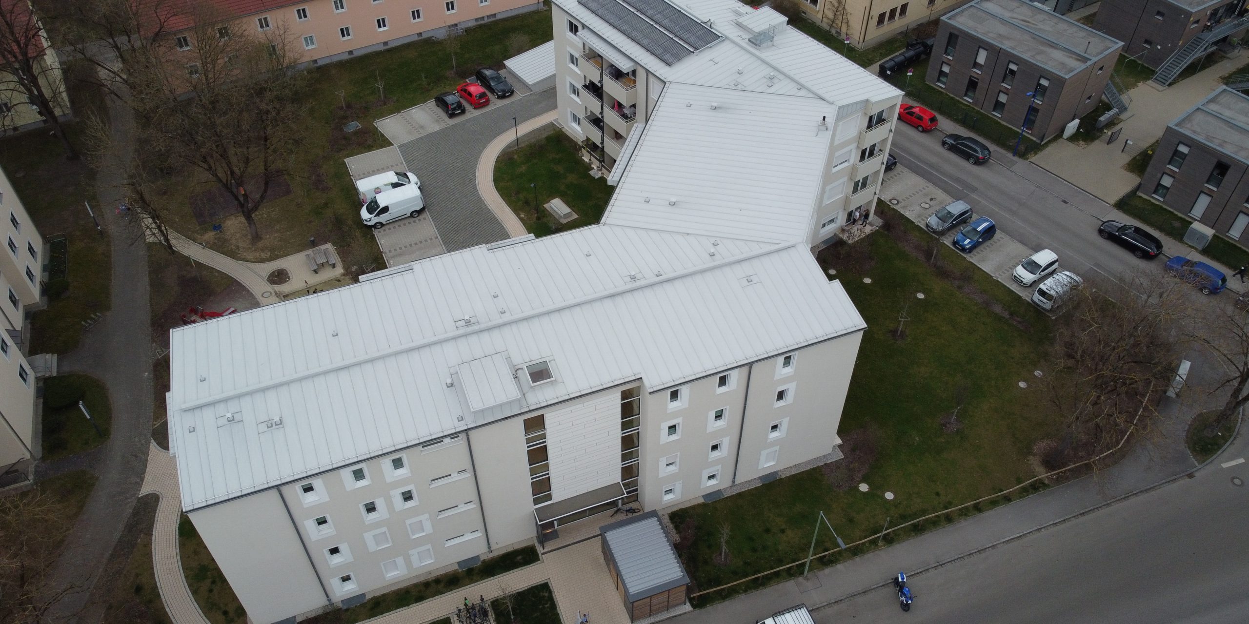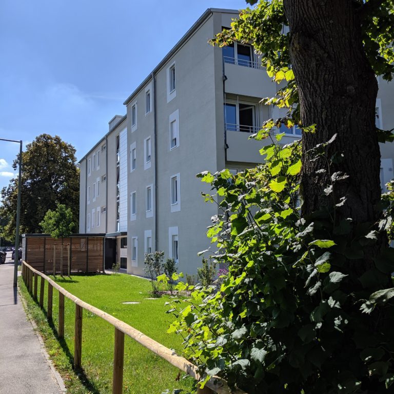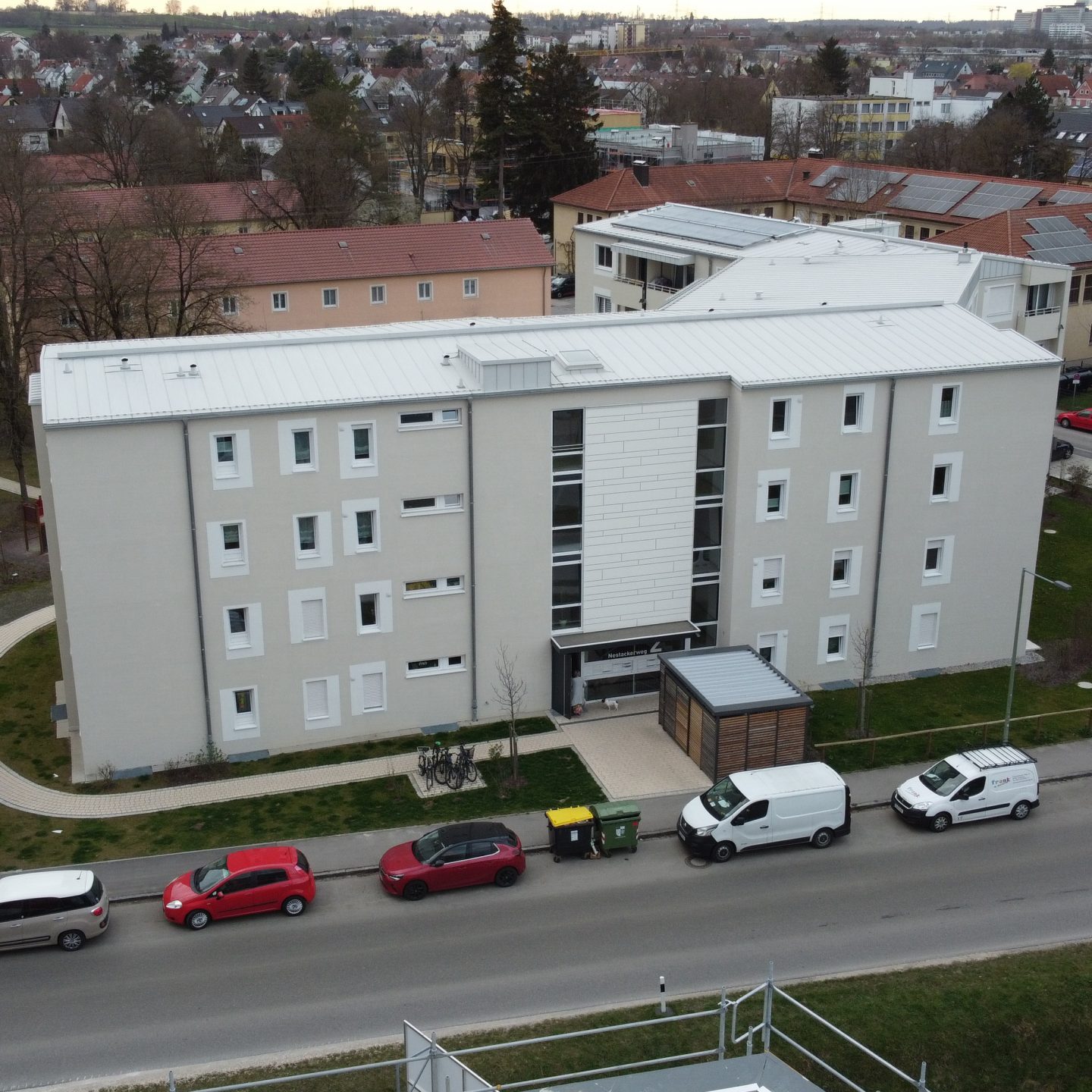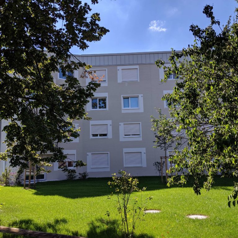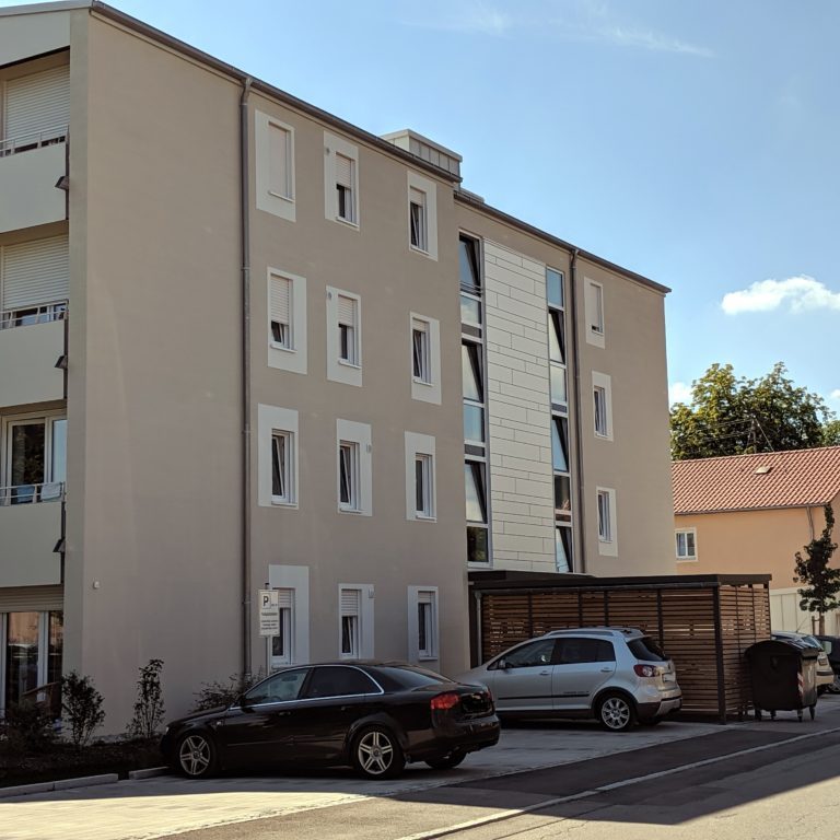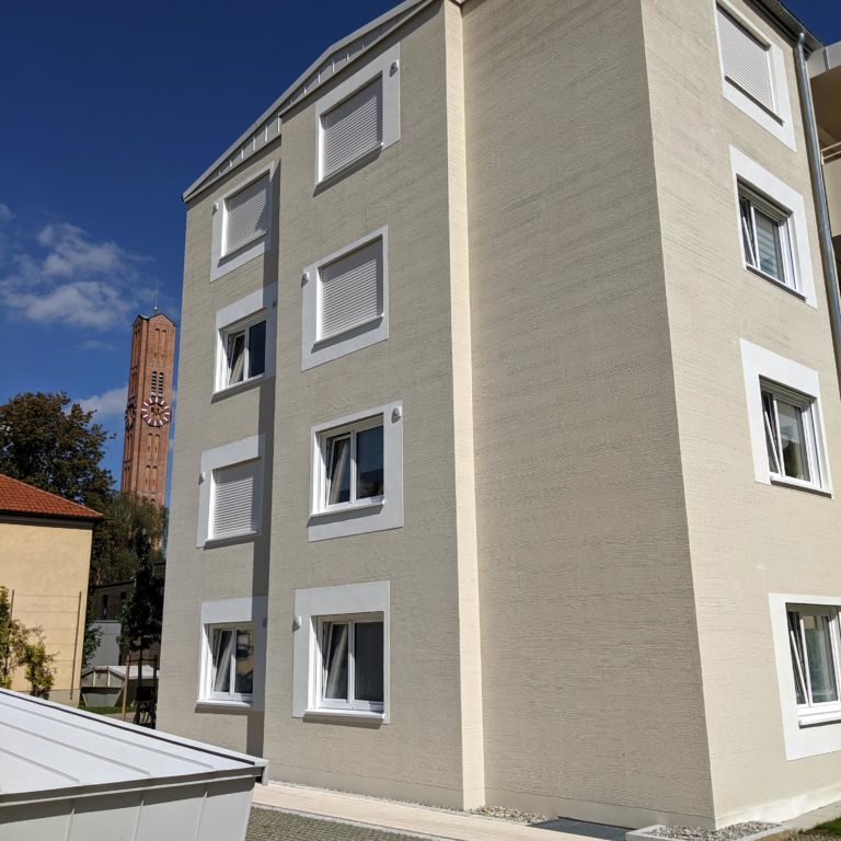Das Objekt befindet sich im Nestackerweg in Stadtbergen gegenüber dem REWE Center. Unsere Firma hat den Außenputz 2018 ausgeführt. Der Aufbau ist dreilagig mit einem Grundputz, Armierungsputz mit Gewebeeinlage und einem Oberputz. Die Besonderheit bei diesem Bauvorhaben ist die Ausführung des Oberputzes als Besenputz. Zudem stehen die Faschen ca. einen Zentimeter über.
