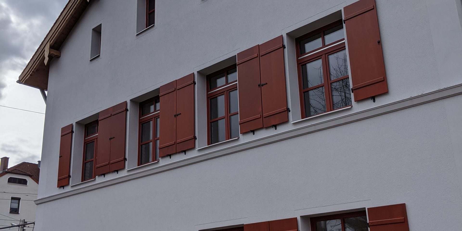 Unsere Leistung: Innenputz sowie teilweise weiß pigmentierte Beschichtung des Mauerwerks Innen, im Außenbereich WDVS mit Besonderheit zweiter Dichtebene unter Fensterblechen, sowie gestalterische Akzente Im Putz.